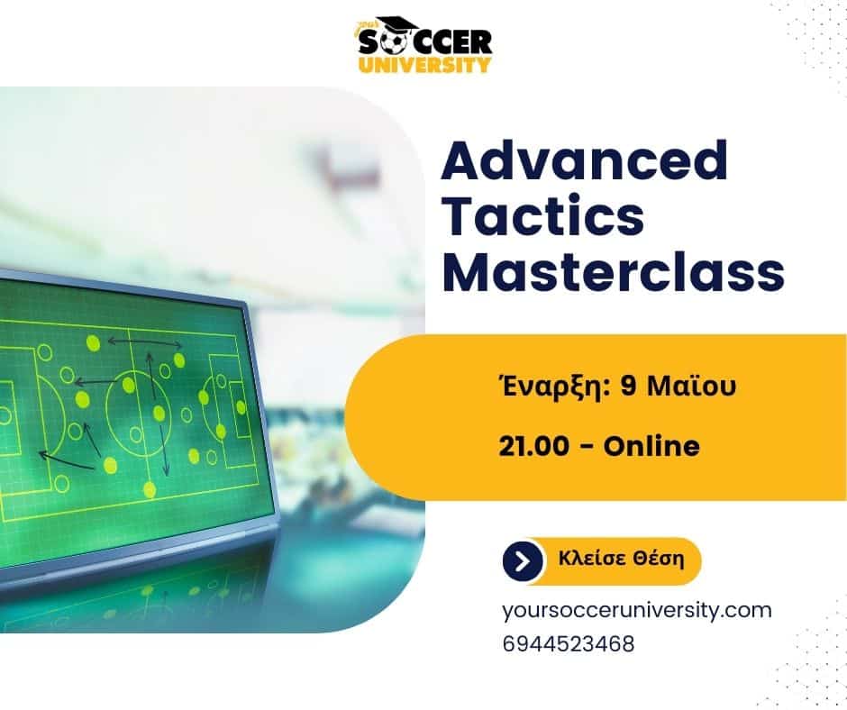 Το “Advanced Tactics Masterclass” απευθύνεται σε προπονητές που θέλουν να κατανοήσουν σε βάθος το πώς σκέφτεται και οργανώνει το παιχνίδι μια σύγχρονη ομάδα. Περιλαμβάνει build-up, pressing traps, επιθετικές και αμυντικές μεταβάσεις, με πλούσιο υλικό και πρακτική προσέγγιση. Συμπεριλαμβάνεται ασκησιολόγιο, στατικό και animation.